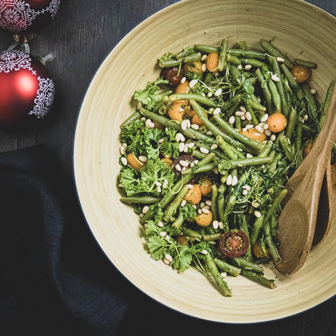 Kokeile Lassen Luomun vihreitä tai violetteja pensaspapuja kevyessä salaatissa! Ranskalaistyylinen persilja-vinaigrette kruunaa maut kohdilleen.