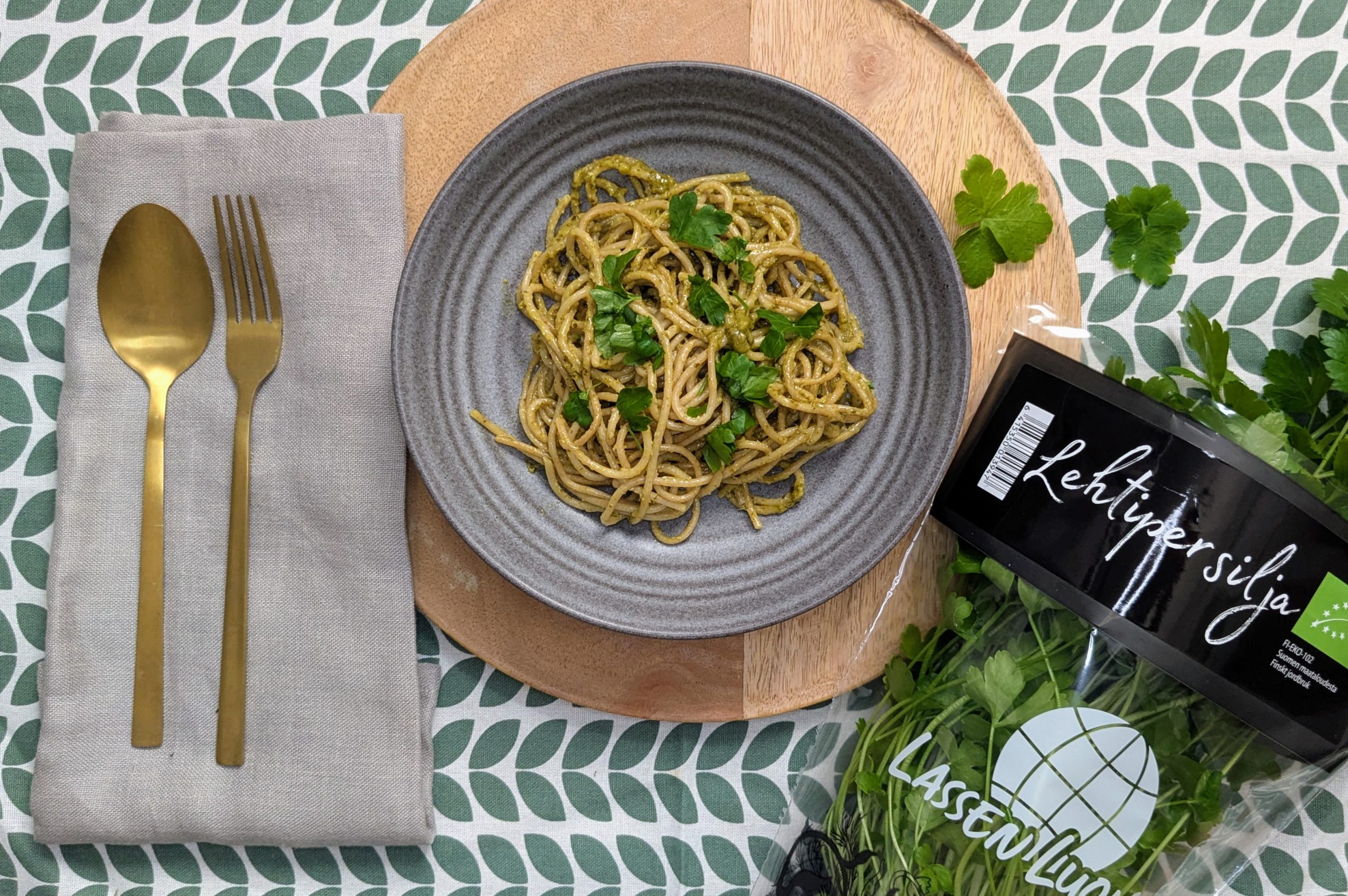 1. Keitä pasta paketin ohjeen mukaisesti. Pastan kiehuessa valmistetaan yrttipesto.